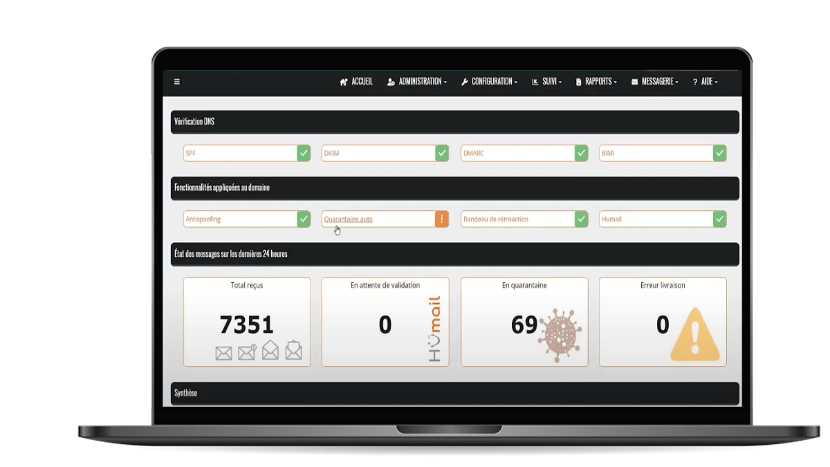 Retrouvez des rapports complets et détaillés (quarantaine, mails bloqués…etc) permettant aux collaborateurs de contrôler leur compte et d’adapter leurs filtrages.