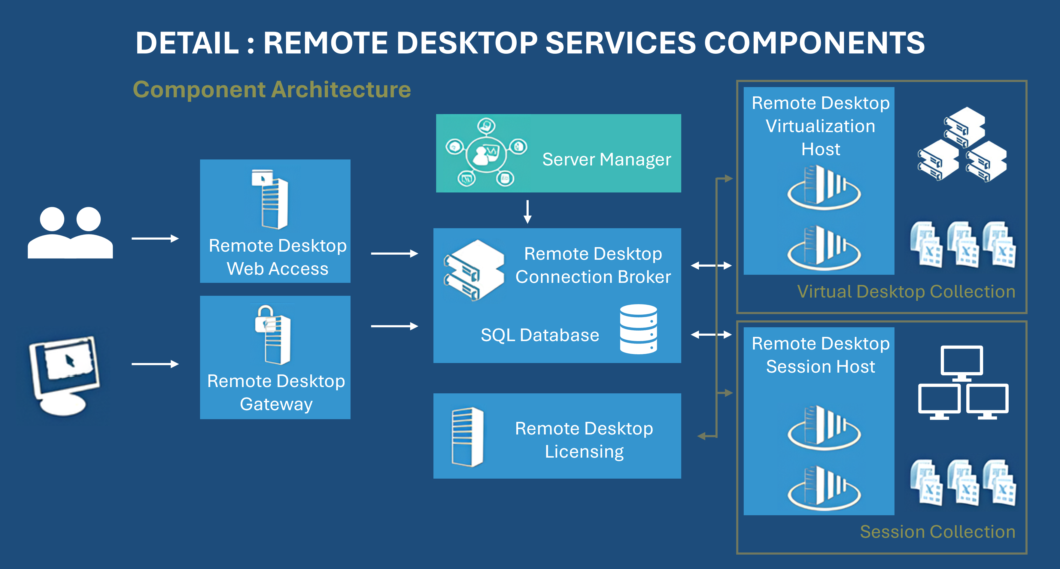 ▪ Hôte de session Bureau à distance (Remote Desktop Session Host) : Ces serveurs hébergent les applications et fournissent la puissance de calcul requise pour leur utilisation. Les utilisateurs y accèdent à distance grâce à des sessions dédiées.
